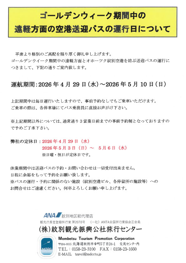 遠軽方面⇔オホーツク紋別空港送迎バス