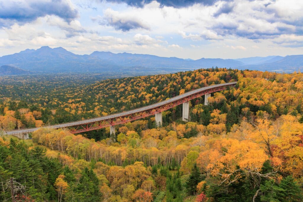 標高1,139m、北海道の国道で最も高い峠「三国峠」。 眼下には四季折々に色を変える壮大な樹海が広がり、紅葉シーズンは特に圧巻です。 赤いアーチが美しい「松見大橋」は絶好の撮影スポット。 頂上の「三国峠cafe」では、絶景を眺めながらコーヒーやソフトクリームを味わえます。