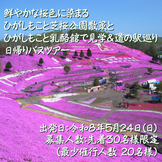北海道大空町にある「ひがしもこと芝桜公園」は、毎年5月に約10万平方メートルの広大な丘がピンク色に染まる絶景スポットです。